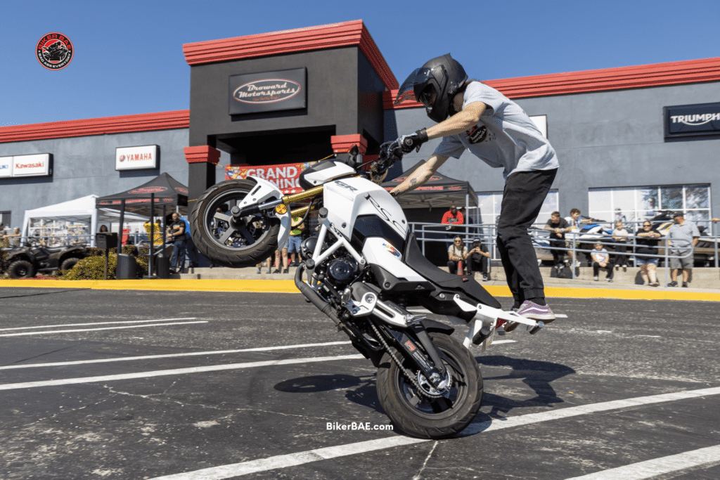 The stunt show kept the crowd locked in, with wheelies and burnouts taking over the lot while riders and spectators gathered around. Between sets, bikes continued to roll in, adding to the mix of sport bikes, cruisers, and off-road machines on display.